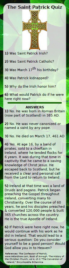 It was so wonderful to hand out the Gospel Truth & the truth of St. Patrick with these fellow Christians! How God has blessed this-it became so simple to say to people, “did you get one of these?” or “Did you take the St Patrick Quiz yet? It tells you what St Patrick did…did you know what that was?” Then “what do you think happens to someone after they die?” When you ask that question, people really look at you as someone who cares….and of course, WE DO care about the most important thing ever: their eternity & what God did to save sinners! The Gospel!!!